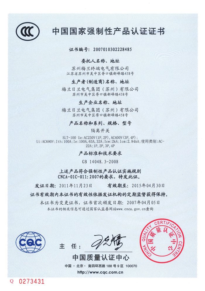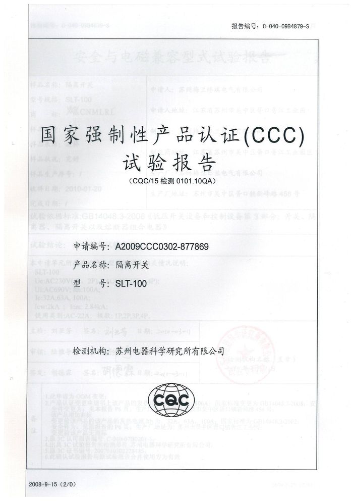 SLT-100隔離開關資質證書