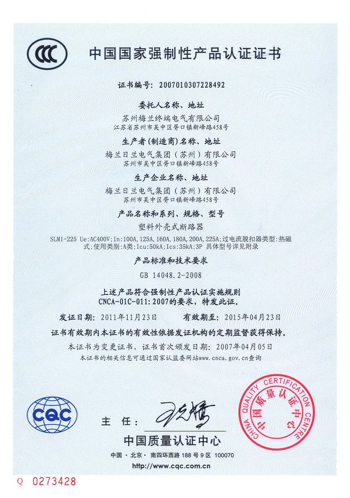 SLM1-225塑殼斷路器資質(zhì)證書