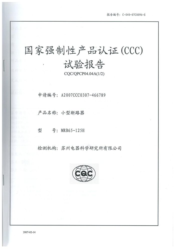 MRB65-125H小型斷路器資質(zhì)證書