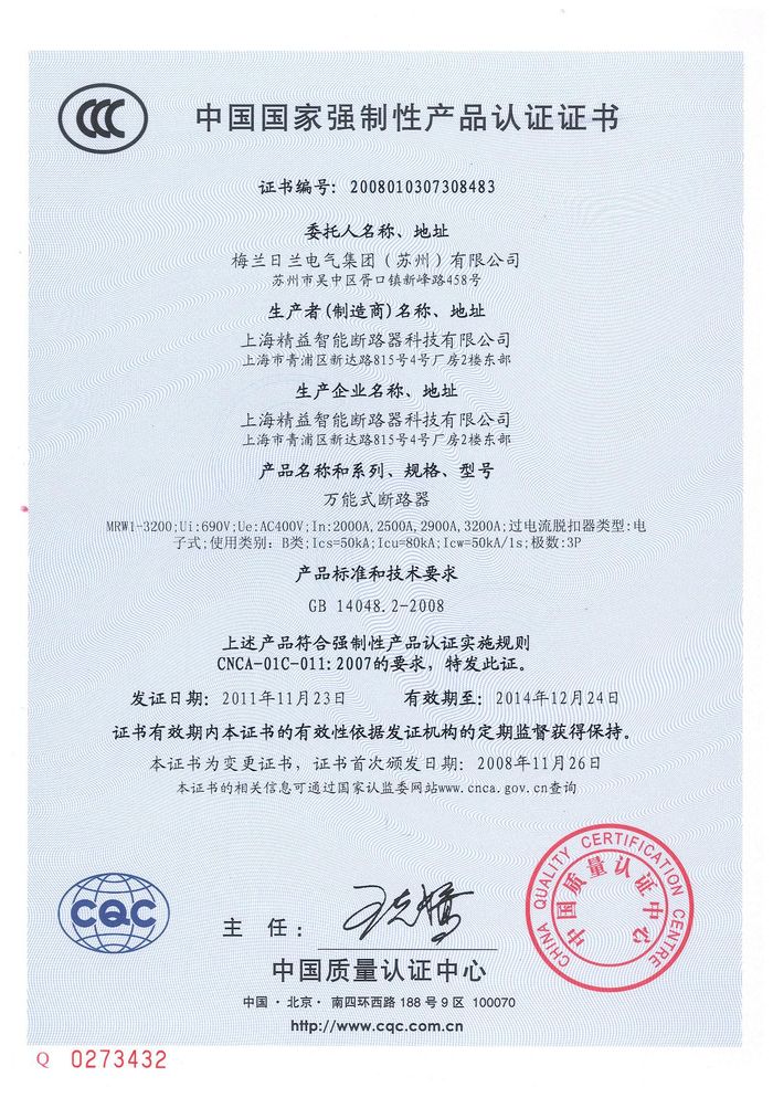 MRW1-3200萬能斷路器資質(zhì)證書