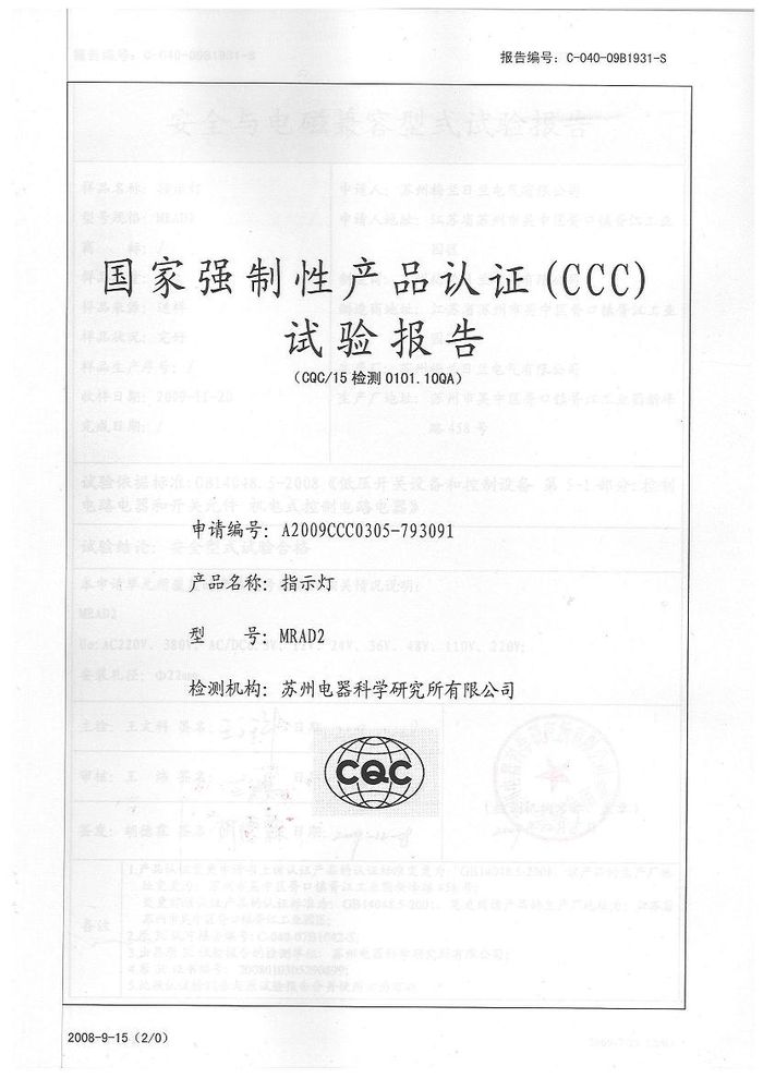MRAD2指示燈資質證書