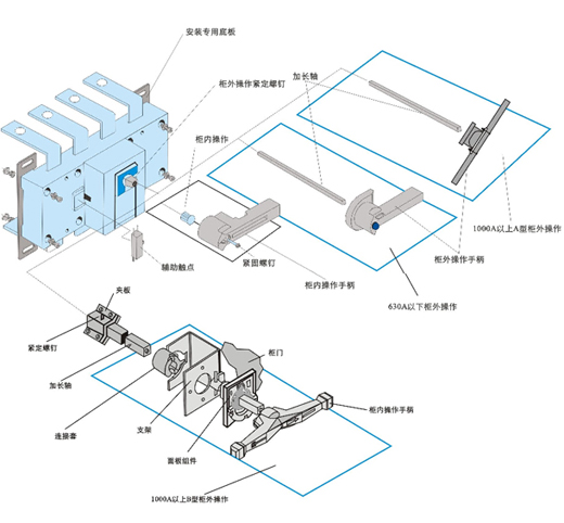 125A-630A適用于電路的接通與分?jǐn)嚯姎飧綦x,1000A以上只適用于電氣隔離。125A-630A有三極、四極(三極+可通斷中性極)。630A以下可根據(jù)需要提供有觀察窗口的產(chǎn)品,直接觀察觸頭的通斷狀態(tài)。可根據(jù)需要配裝兩組輔助觸點。電氣性能與機(jī)械性能和MRGL-125“1600A電氣性能與機(jī)械性能相對應(yīng)。