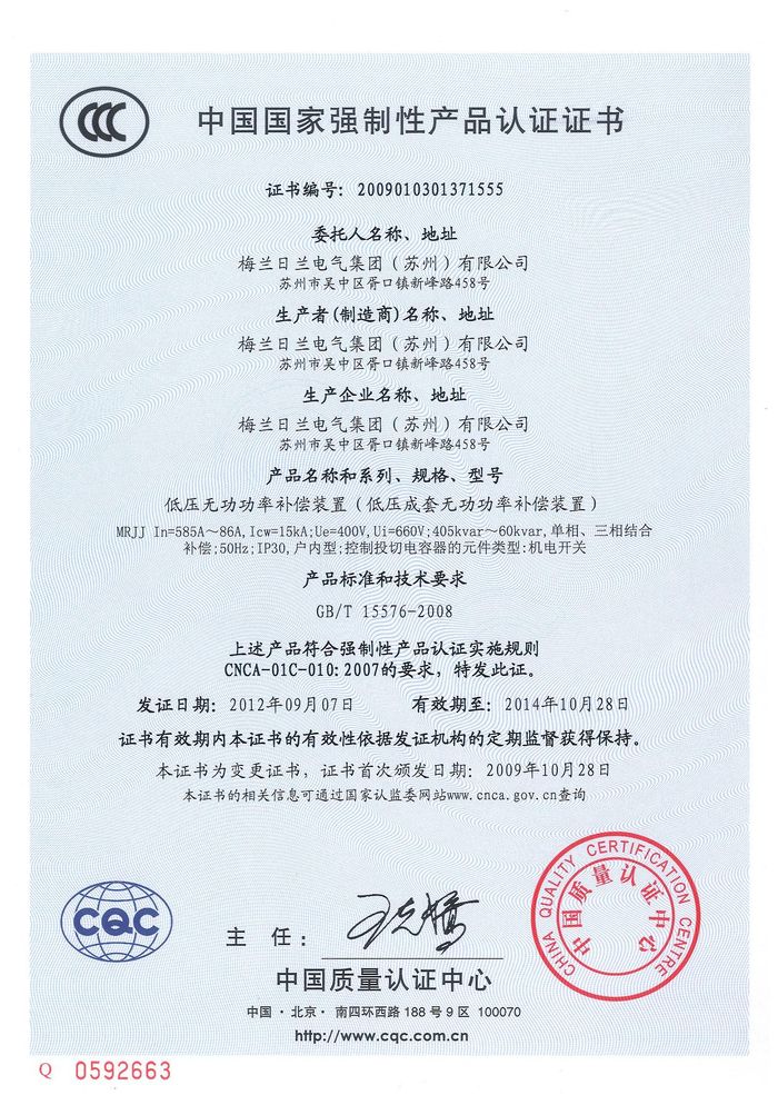 (成套)MRJJ無功柜資質(zhì)證書