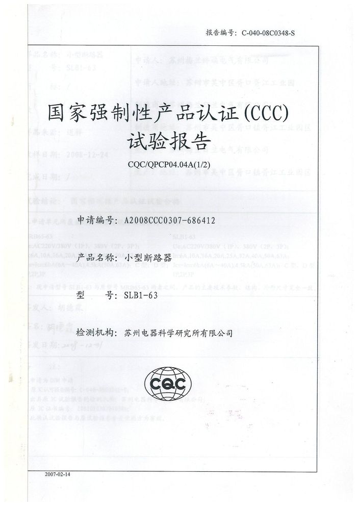 SLB1-63小型斷路器資質證書