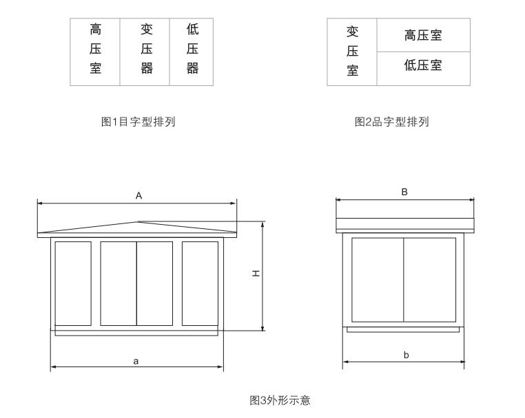 YBW型系列組合式變電站,要根據(jù)排列方式分“目”字(圖1)和“品”字(圖2)排列,也可以根據(jù)需要演化成其它型式。